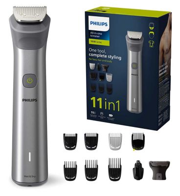 This Philips Series 5000 11-in-1 multi-grooming trimmer provides comprehensive styling solutions for the face, head, and body using one versatile device. It incorporates numerous attachments designed to cover all your trimming and detailing requirements efficiently. This versatile system supports both wet and dry usage options for added convenience during your routine.