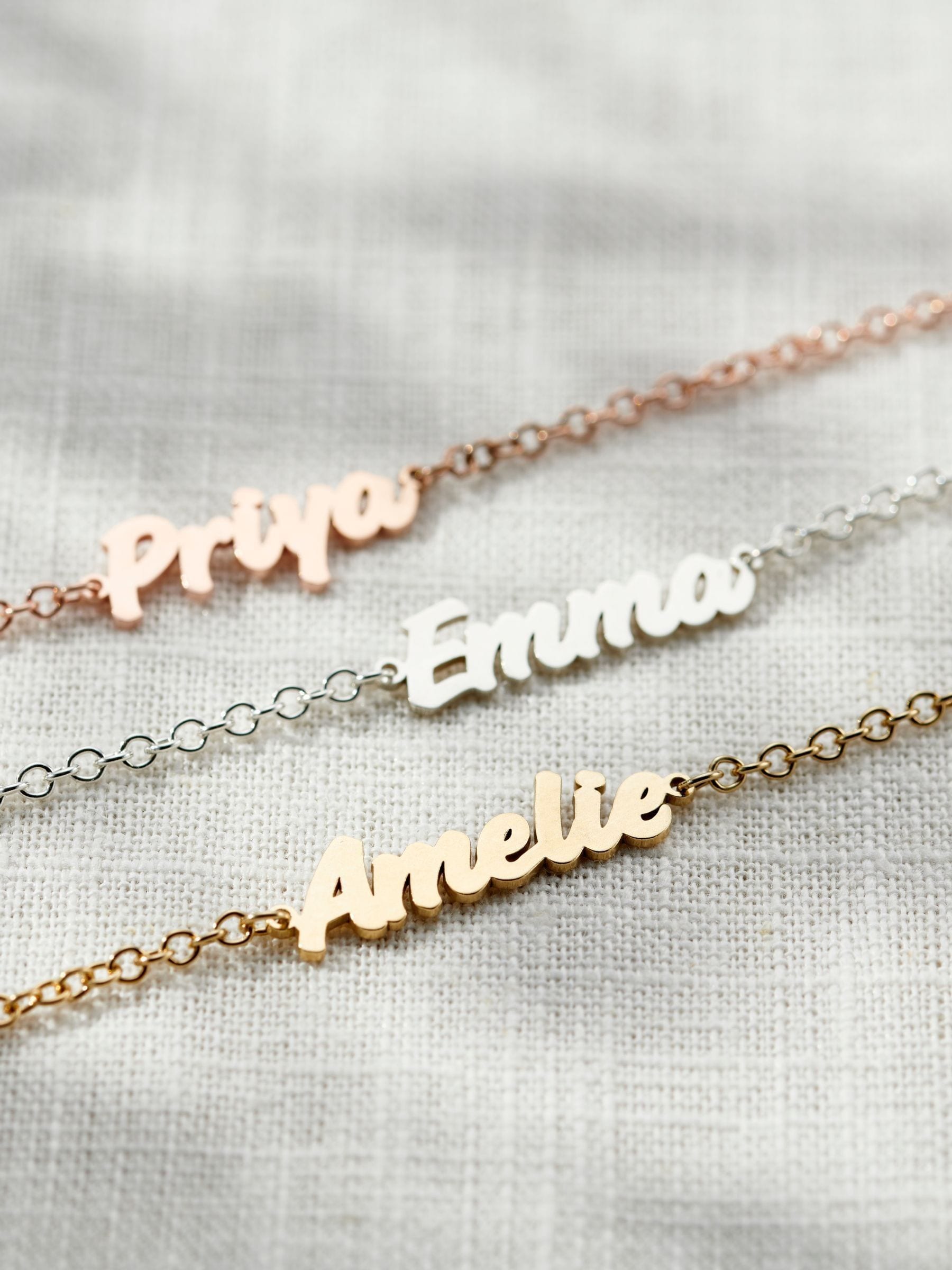 This beautiful Mini Name Bracelet is a truly unique piece of jewellery. Featuring your name in 18ct yellow gold plated Sterling Silver cut out by our engravers and suspended on a stunning bracelet chain. The perfect gift for yourself or a loved one. Made from: 18ct yellow gold plated 925 Sterling Silver. Dimensions: Each name bracelet size will depend on the length of your name. Eg 'Laura' is approx 2.7cm end-to-end. Our standard bracelets measure approx 19cm.