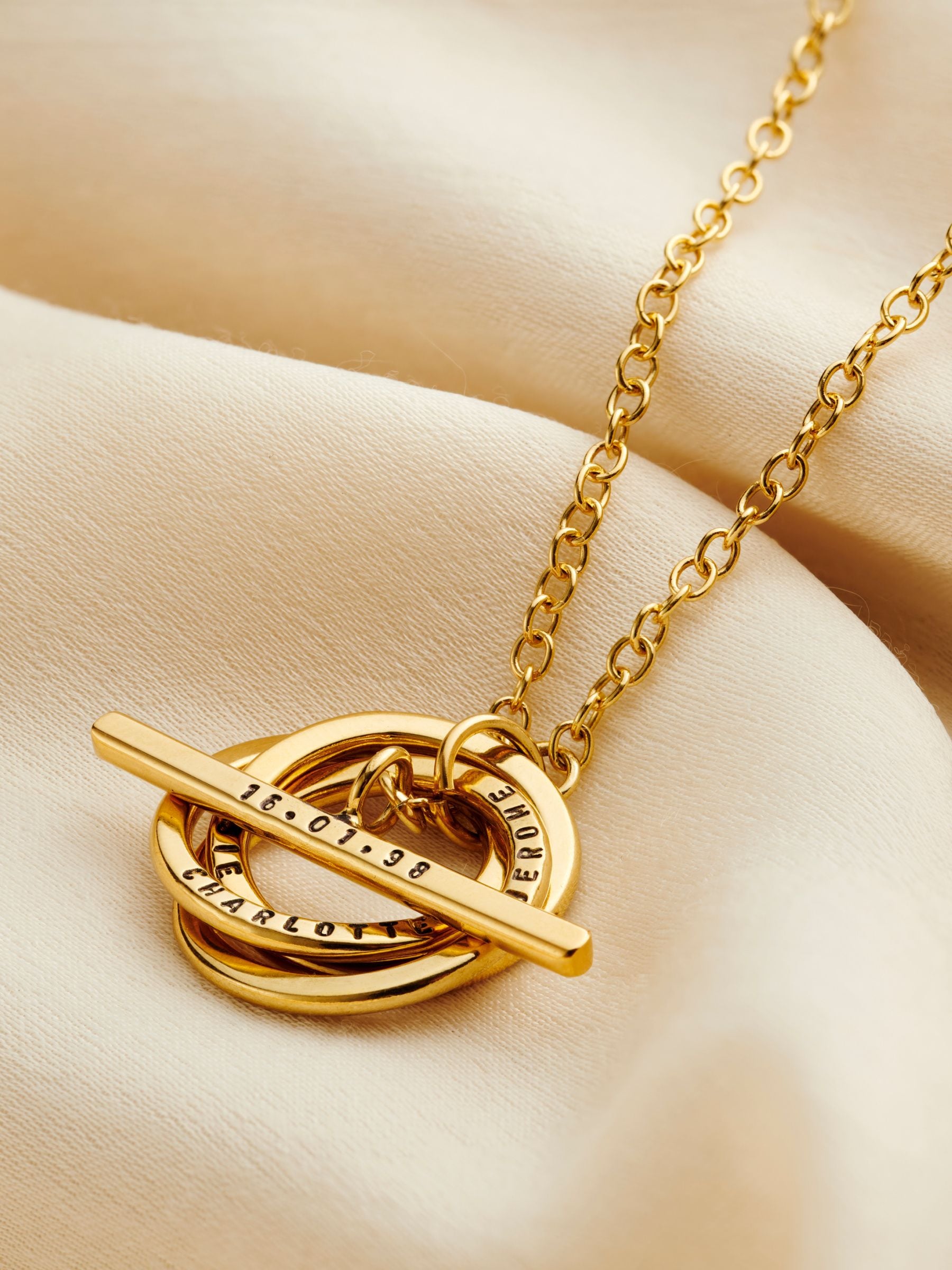 This gorgeous take on our classic Russian ring necklace is made in our Brighton workshop. Crafted from 18ct yellow gold plated Sterling Silver by our expert jewellers, this design features an intertwined Russian ring design paired with a large T-Bar which is interlocked. Our jewellers can personalise this necklace with your chosen words, names or dates.