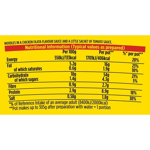 Read MoreHungry but on the go? Be the chosen Juan with our Pot Noodle Chicken Fajita that will set your taste buds singing. These quick-to-make noodles deliver a taste explosion with a chicken fajita flavour sauce and a little sachet of tomato sauce – MEXcellent for when your stomach’s grumbling but you’re short on time. Sounds delicious, right? Plus, it's dead easy to make, so even if you aren't a master chef, you can make it. Simply add water, stir, and in just 4 minutes you have a piping hot, deliciously satisfying snack. Suitable for vegetarians and vegans, our instant noodles are free from artificial colours and preservatives so you can eat them up with NO worries. At Pot Noodle, our mission is to deliver the ultimate snack-isfaction. We understand that less time cooking means more time chasing your dreams. That’s why our Standard snack pots are designed to be quick and convenient. Plus, our lid and pot are recyclable, so don’t forget to recycle the packaging. Like mixing it up? With Pot Noodle, there’s a whole world of flavour to explore. From Sticky Rib to Original Curry noodles, our snack pot range has something for everyone. So, why not try something new and take your taste buds on an adventure? *Made to vegan standards. See the ingredients section for allergens.