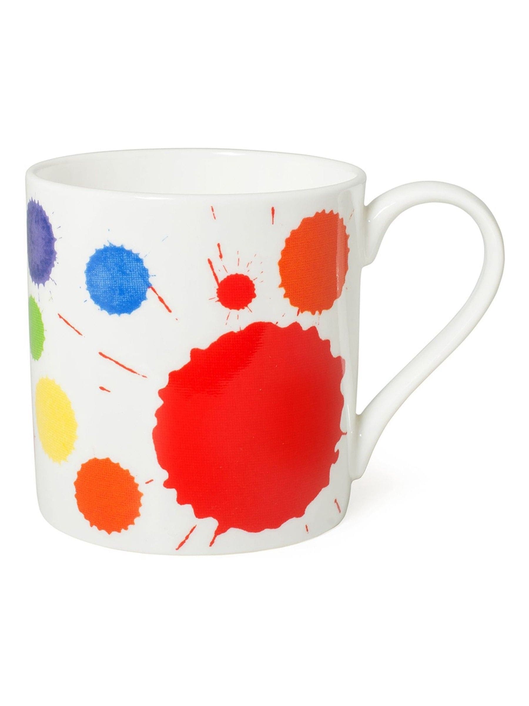 This colourful bone china mug is part of the new Pure Prue collection of tableware from British TV personality, cook and author Dame Prue Leith. The artwork was created with Prue s collaboration by dropping coloured inks onto textured paper, the splats contrast beautifully with the bright white bone china creating a stunning piece of drinkware. The Pure Prue collection of ceramic tableware also includes side & dinner plates, supper bowls and a spiral rainbow platter, all in bold hues in abstract patterns. The bone china tableware is dishwasher, freezer and microwave safe, perfect for everyday use.