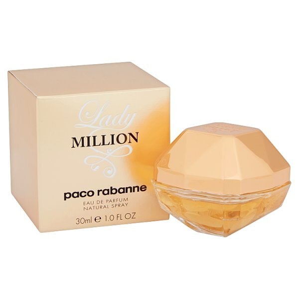 lady million the ultrafeminine fragrance for women by rabanne a carnal white floral fragrance diamondbright and daring shine for all to see because decadence is thrilling a trail of white flowers awakens the skin with fresh notes and exudes an intimate woody warmth infused with notes of jasmine orange blossom and honey an addictive scent seductive sensual the striking gold bottle is fun fabulous and created for a glamorous confident woman perfectly packaged in decadent gilded gold