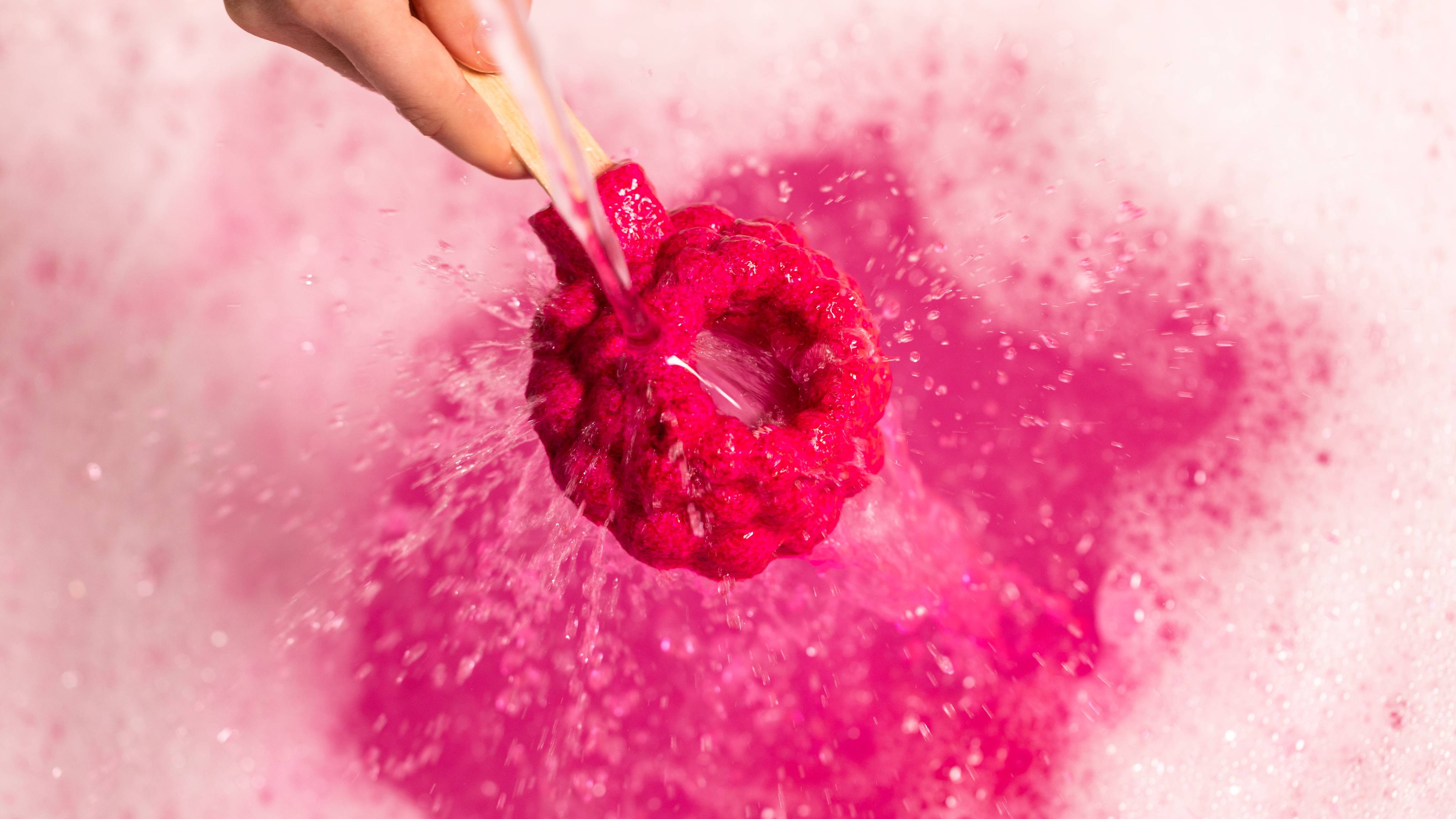 Banish boring bathing by swishing your Raspberry Blower around your tub as it fills. When you're happy, hold the flat side to your lips and gently blow to release sweet-smelling bubbles bursting with benefits.