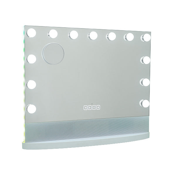 It is equipped with 13 high-quality LED bulbs, offering three dimmable light colour modes: warm, natural, and cool white. This allows you to freely adjust the lighting according to your needs and create the perfect ambiance for your beauty routine. One of the standout features of this mirror is its built-in Bluetooth connectivity, which lets you play your favorite music through the integrated Bluetooth speaker for a relaxing and enjoyable experience. Adding to this is the vibrant LED Ambient Light Strip, which not only enhances the aesthetic appeal but also syncs with the rhythm of the music, creating a dynamic and immersive lighting effect. Experience the allure of Hollywood glamour in your own home with this dream makeup mirror!