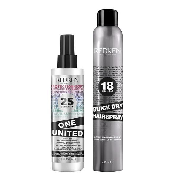 Give your hair the ultimate shine and a firm hold with this duo of products. Contains: One United Elixir 150ml Redken Quick Dry Hairspray 400ml Redken One United Multi-Benefit Treatment is a leave-in haircare treatment to protect, repair and beautify hair, leaving it easier to style and looking full of shine. Quick Dry controls and completes your style with a fast, firm, no-fuss finish. Easy to use and fast drying, the shaping mist works as an instant finishing hair spray. It quickly sets to offer a firm hold which makes it easier for you when styling, and the long-lasting formula keeps your hair in shape whilst imparting high shine. Perfect for creating that big, bouncy blow-dry. Ingredients: One United: Aqua / Water / Eau, Cocos Nucifera Oil / Coconut Oil, Amodimethicone, Polyquaternium-37, Phenoxyethanol, Propylene Glycol Dicaprylate/Dicaprate, Parfum / Fragrance, Acetamide Mea, Lactamide Mea, Dimethicone PEG-7 Phosphate, PPG-1 Trideceth-6, Trideceth-6, Behentrimonium Chloride, Xylose, Lactic Acid, Ethylhexylglycerin, Cetrimonium Chloride, Hydrolyzed Vegetable Protein PG-Propyl Silanetriol, Citronellol, Geraniol, Linalool, Alpha-Isomethyl Ionone, Viola Odorata Extract, Viola Odorata Flower/Leaf Extract, Sodium Hydroxide. Quick Dry: Alcohol Denat., Dimethyl Ether, Butane, Va/Crotonates/Vinyl Neodecanoate Copolymer, Aminomethyl Propanol, Peg/Ppg-17/18 Dimethicone, Parfum / Fragrance, Peg/Ppg-18/18 Dimethicone, Amp- Isostearoyl Hydrolyzed Wheat Protein, Hydroxycitronellal, Benzyl Benzoate, Benzyl Alcohol, Alpha-Isomethyl Ionone, Linalool, Hexyl Cinnamal, Limonene, Citronellol, Geraniol (D43072/5)
