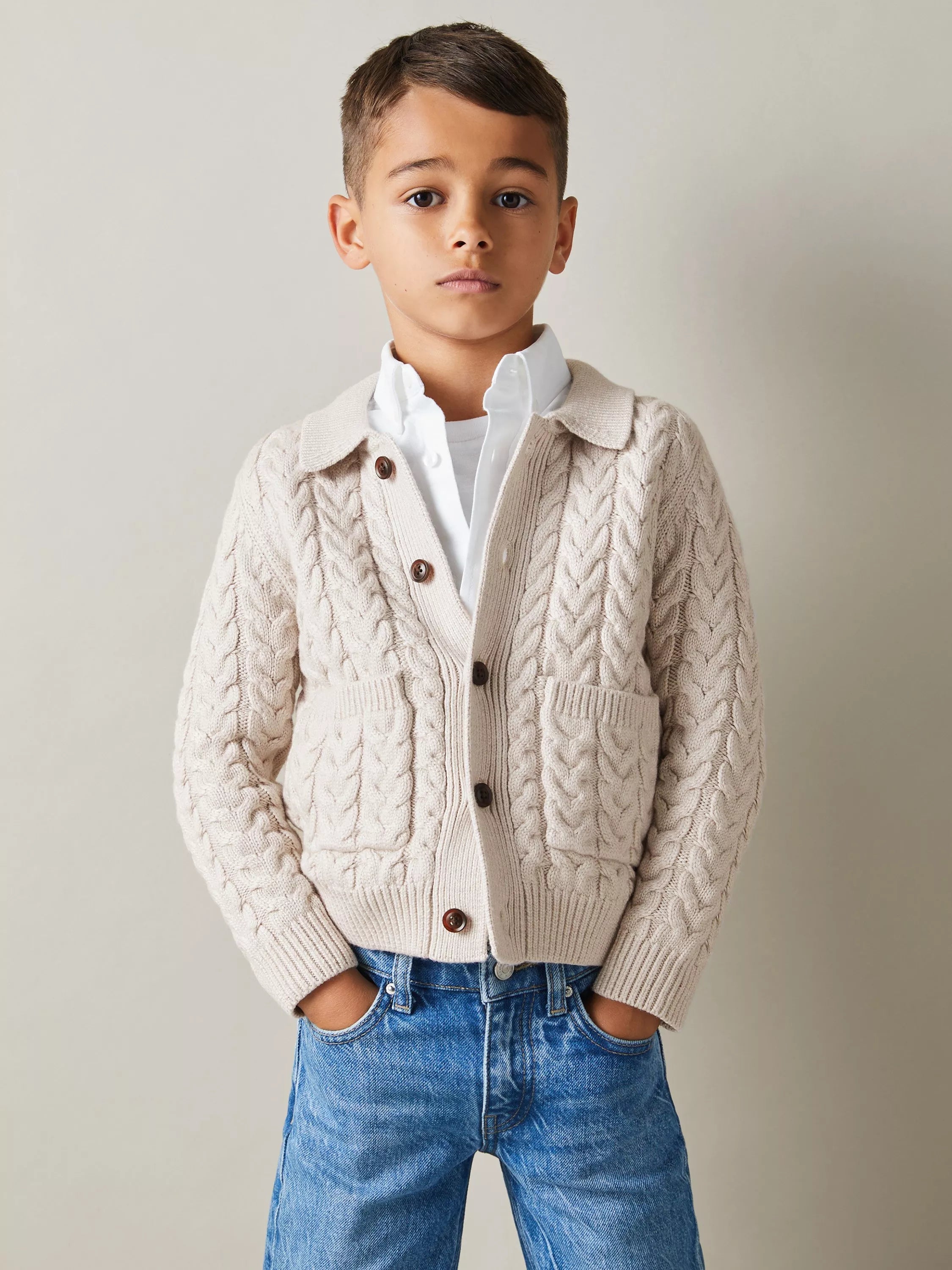 Smart layering at its finest. Made from a supersoft blend imbued with wool, this collar neck cardigan from Reiss features cable knit detailing, patch pockets and a button up front.