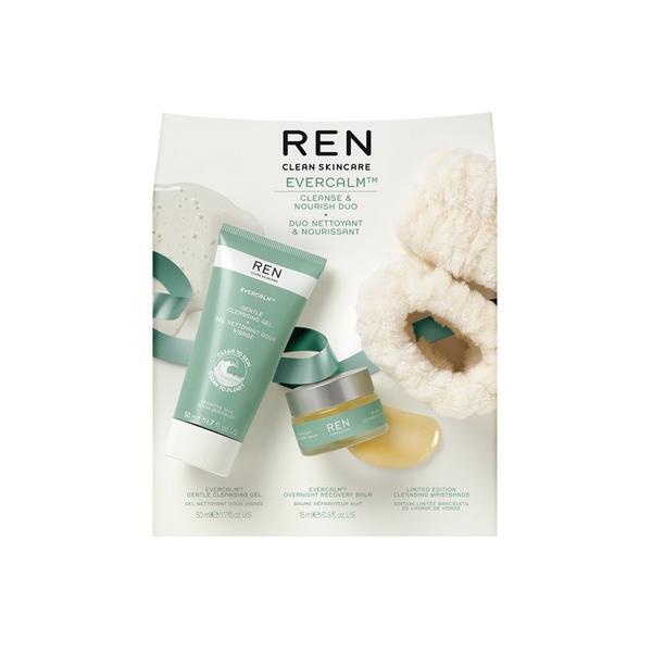 - seller duo for you to trial. The additional cleansing wristbands are super handy to avoid water running down your arms when washing your face. Perfect for someone who loves to fake tan or keep their space clean and dry. This set includes: Evercalm Cleansing Gel 50ml Soothe skin sensitivity with this skin cooling cleanser which is lightly fragranced with uplifting Neroli, it removes excess dirt, oil and impurities without stripping the skin of moisture. Infused with a bioactive blend of Beta Glucan designed to calm and help strengthen the skin barrier to reveal comforted and refreshed skin. It is also enriched with Prebiotics that aid skin recovery and help to maintain a balanced skin microbiome leaving skin hydrated, comforted and better protected against future sensitivity flare ups. Evercalm Overnight Recovery Balm 15ml: A powerfully rich night balm from REN. Feeds your skin with lipids from Almond, Borage, Linseed and Olive oils which have been activated so they're easily absorbed by the skin, deeply moisturising and nourishing it. Works overnight while you sleep, when the skin's own regenerative process takes place, for maximum results. With a Sunflower and Jojoba oil complex that supports the skin's natural lipid balance, strengthening its protective barrier. Complete with Beta