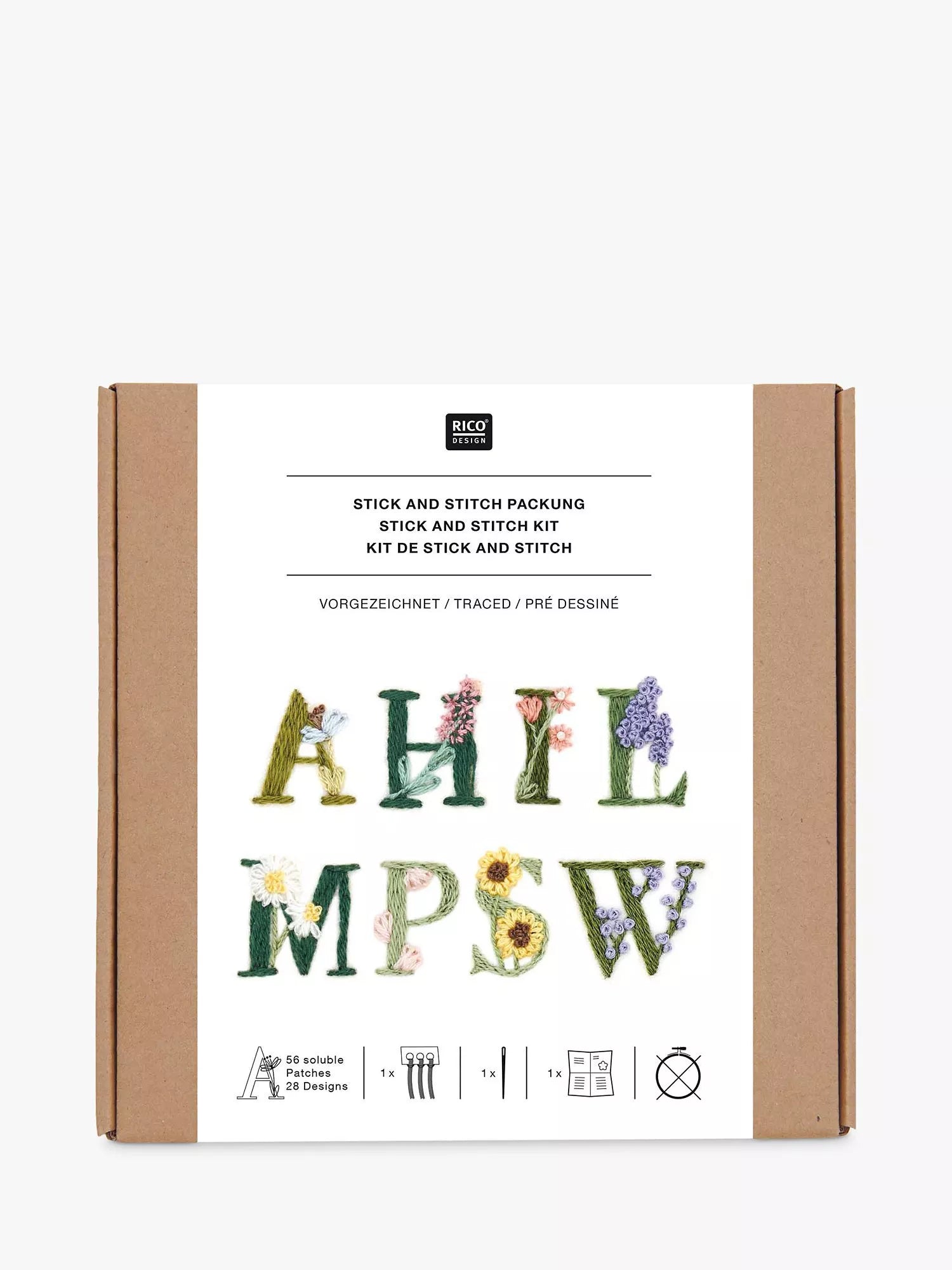 This kit includes everything you need to finish a beautiful embroidery project. Use the stick on letters as templates for your floral embroidered alphabet.