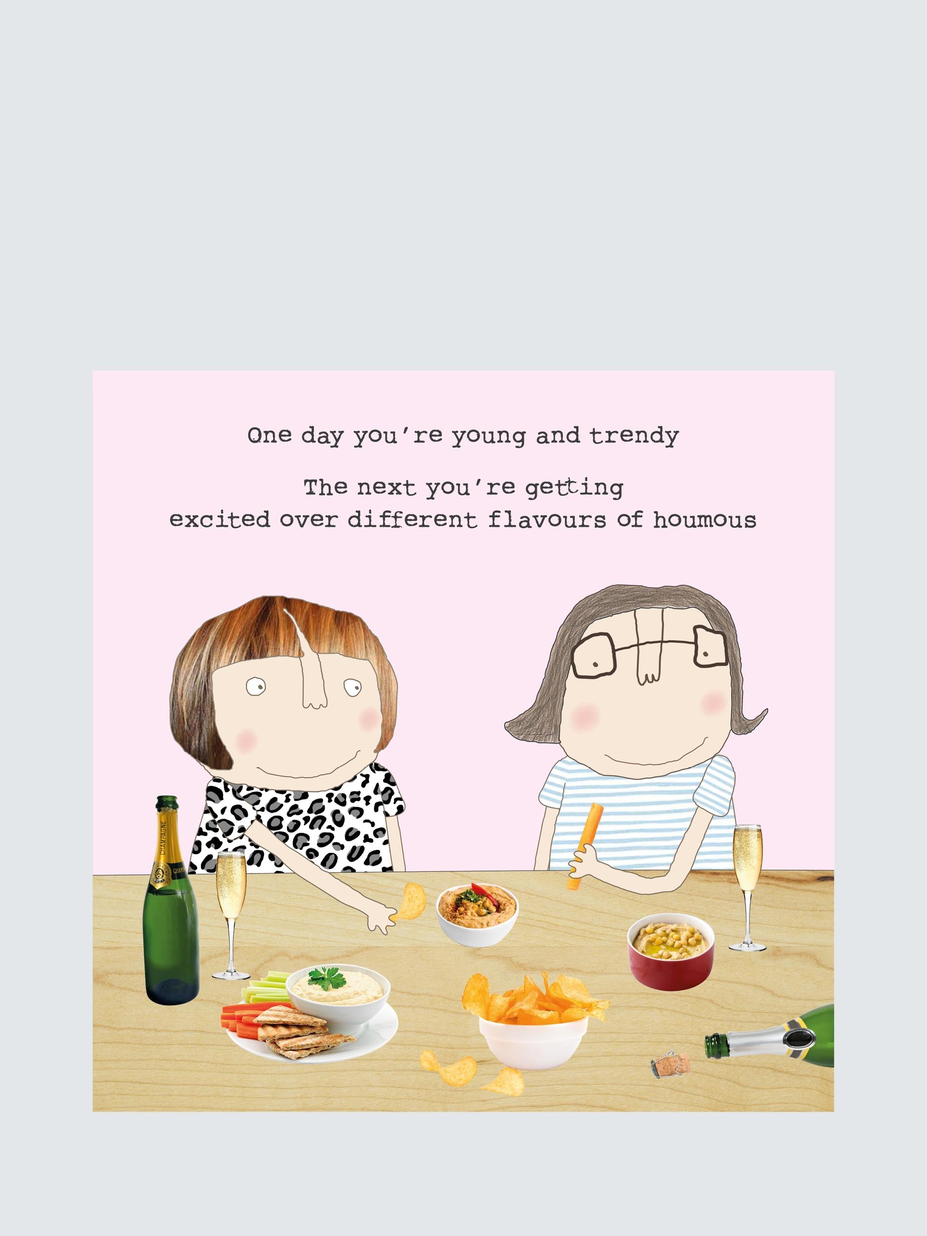 This Rosie Made A Thing Houmous Greeting Card offers a delightful touch for any sending occasion. It features a vibrant design perfect for sharing light-hearted moments with friends or family. The inside is left completely blank, awaiting your personal, heartfelt message inside. This quality card comes supplied with a coordinating grey envelope ready for posting.