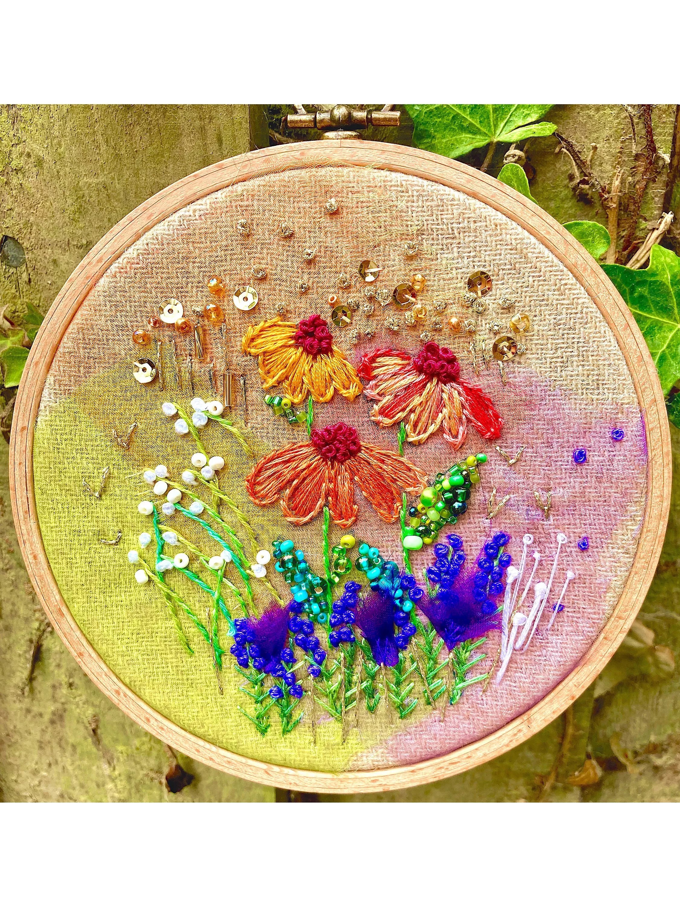 Inside this mini plus kit you'll find fabric with the design clearly printed, threads on an organizer card, clear, foolproof instructions and diagrams, a chenille needle and, on the front cover, Rowandean's "see every stitch" colour photo.