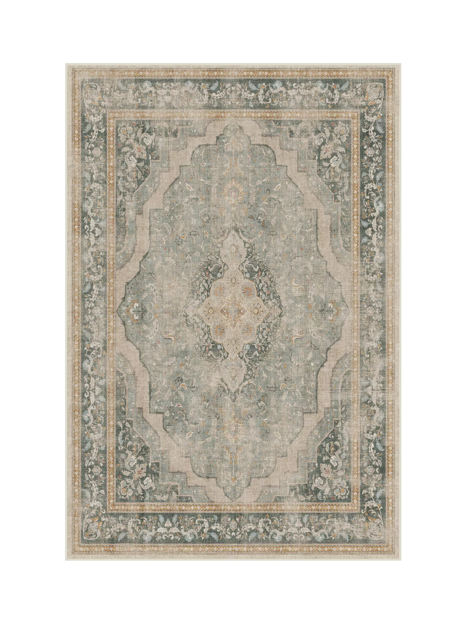 Inspired by classic European rug patterns, the Adeline Rug features a gently distressed diamond medallion with ornate corners and borders. Made from our water-resistant, stain-resistant, and machine-washable low-pile Chenille material.
