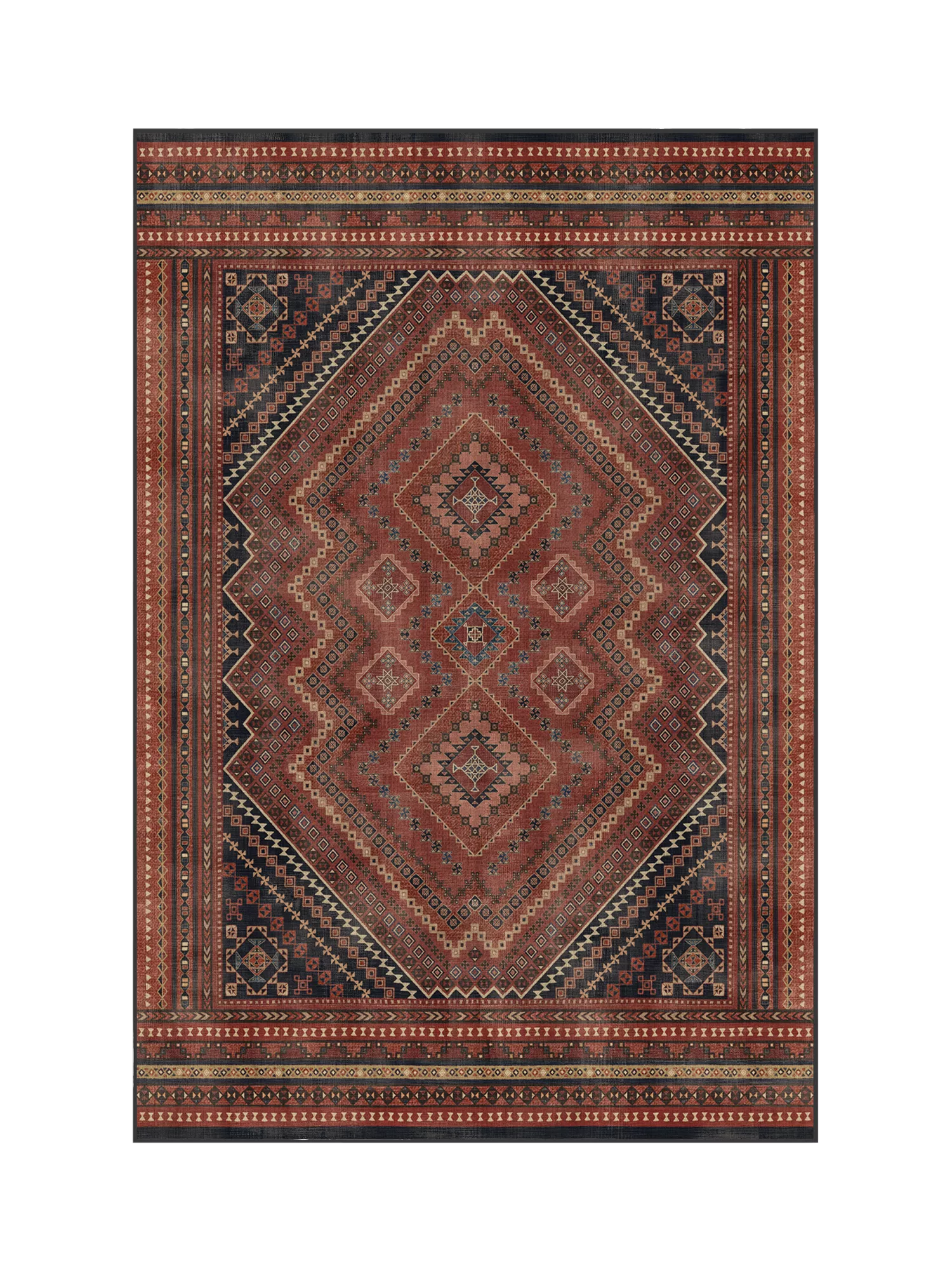 Geometric meets traditional. This rug features a central diamond medallion surrounded by repeating shapes. Water-resistant, stain-resistant, and machine-washable.