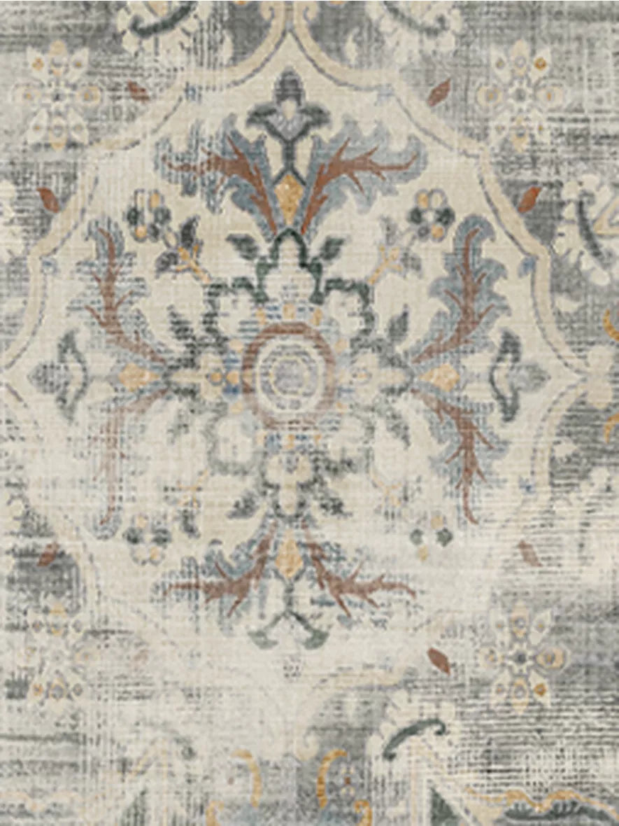 Warm and rustic. Beautiful shades blend together in this rug to create a beautifully rich, distressed design featuring a floral medallion and border. Water-resistant, stain-resistant, and machine-washable.