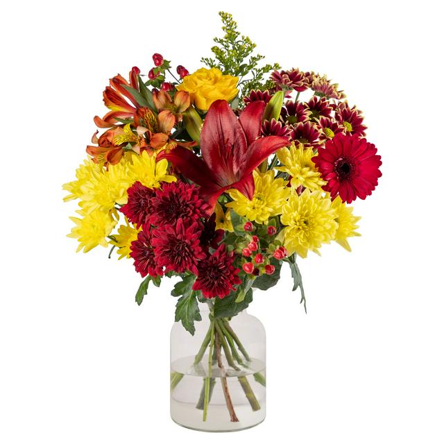 This vibrant arrangement captures the rich colours and feeling of the changing seasons perfectly. It is composed of diverse, fresh blooms presented beautifully in a clear glass vase. This bouquet offers an immediate splash of warmth and elegance to any indoor space or special occasion.