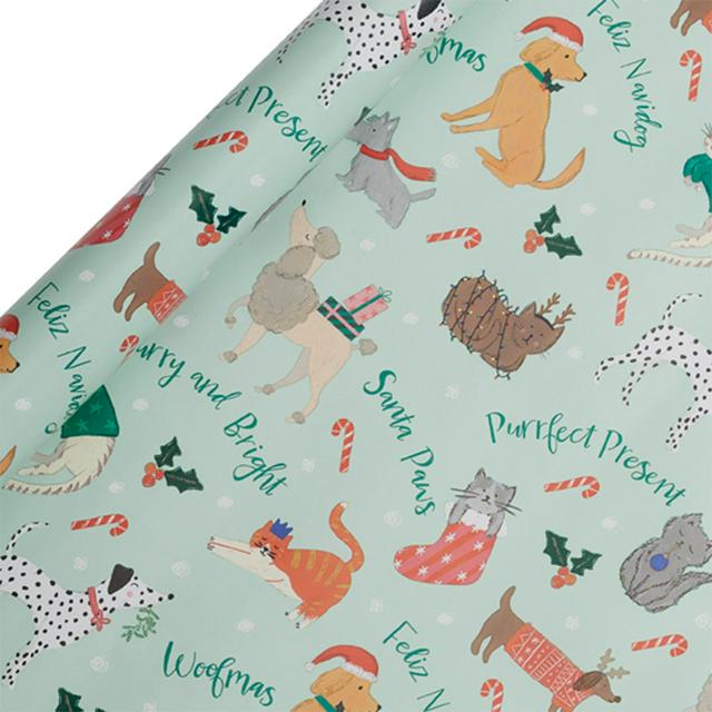 This wrapping paper features cheerful designs of cats and dogs dressed in festive attire, ideal for wrapping seasonal gifts. Measuring 4 metres in length, this paper offers ample coverage for several presents. It is manufactured in the UK and provides a recyclable option for your celebratory packaging needs.