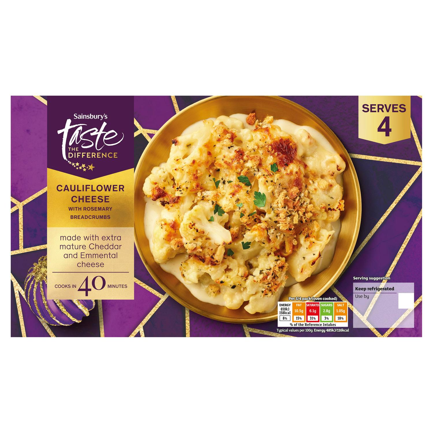 This Sainsbury's Taste the Difference ready meal features tender cauliflower florets enveloped in a rich cheese sauce. The product showcases quality ingredients crafted by culinary experts dedicated to flavour. Enjoy a convenient side dish or light meal prepared with care.