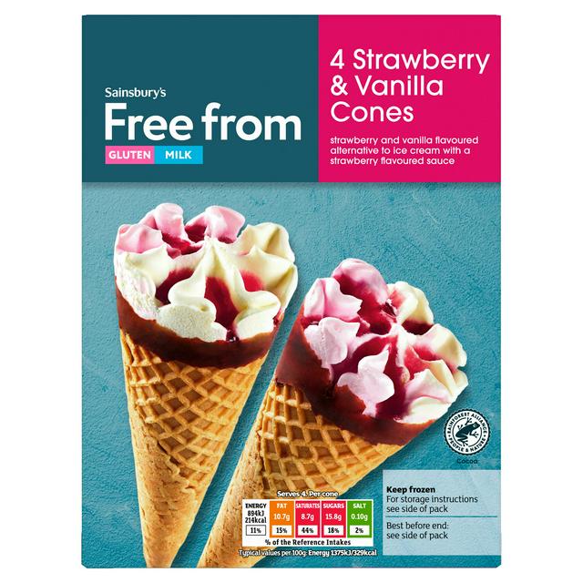 Enjoy a satisfying frozen treat with Sainsbury's Free From Strawberry & Vanilla Cones. These four cones offer a delicious alternative to traditional ice cream, crafted specifically without gluten or milk. Each portion delivers classic strawberry and vanilla flavour enhanced by a complementary strawberry sauce swirl.