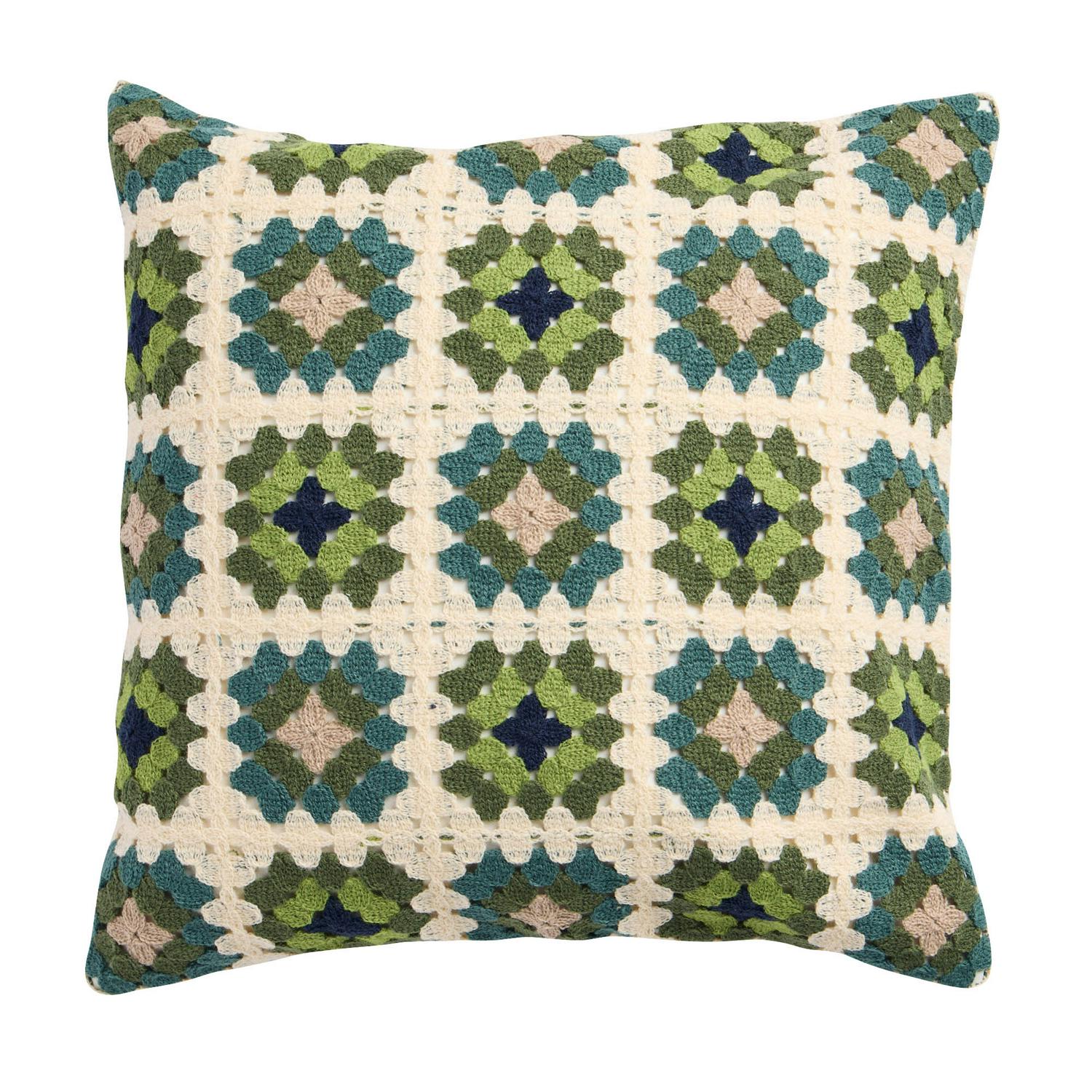 Read MoreLove the charm of crochet? We do. This retro cushion wows with its complex geo pattern in mellow hues of green. Just the thing to add a splash of personality to a sofa or chair. Simply flip over for a sea of calm forest green. Plumply filled with cotton, it's a treat to cuddle up to.