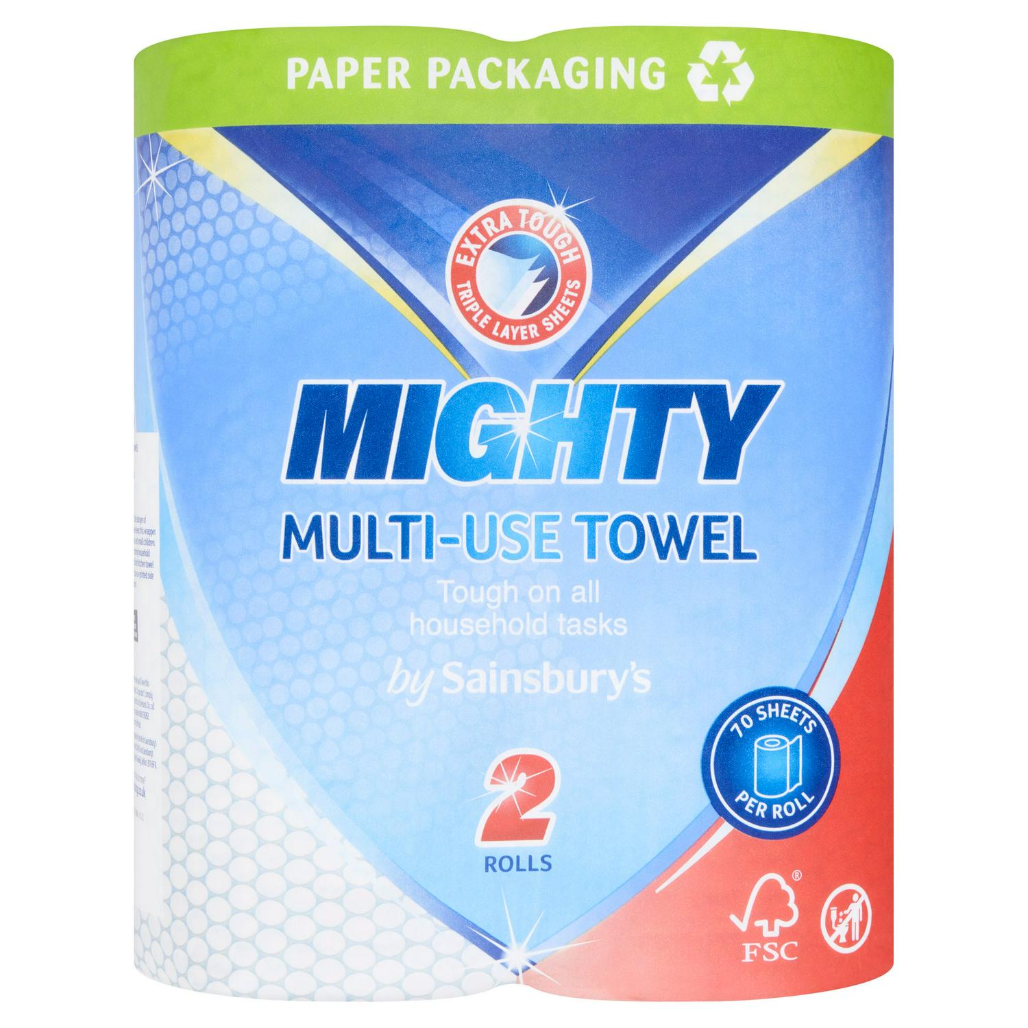 This Sainsbury's Mighty Multi-Use Towel pack contains two rolls for effective household cleaning tasks. Each roll supplies 70 large sheets, offering good value for regular use around the home. The paper is constructed with three plies for enhanced strength and absorbency when dealing with common spills.