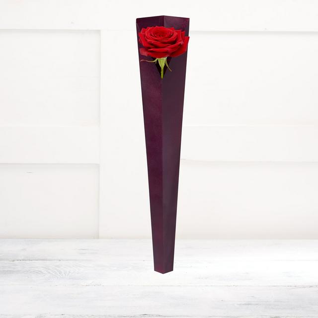 • Features a single, striking red rose, a traditional symbol of deep affection.