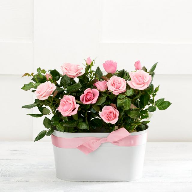 This Sainsbury's Rose Duo features a vibrant display of miniature pink roses presented in a modern, rectangular planter. The living arrangement offers immediate visual appeal, making it a thoughtful gift or an instant refresh for any room decor. The healthy green foliage beautifully complements the numerous delicate blooms evident upon arrival.