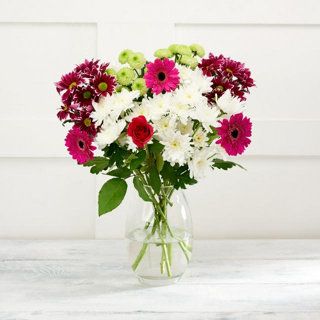 This Sainsbury's Spring Jewel Bouquet offers a rich, visually appealing mix of high-quality cut flowers designed to enhance any interior space. The arrangement combines diverse textures and vivid colours, capturing the essence of a seasonal floral display. Presented ready-to-display in a clear glass vase, this selection brings instant charm and freshness to your home.