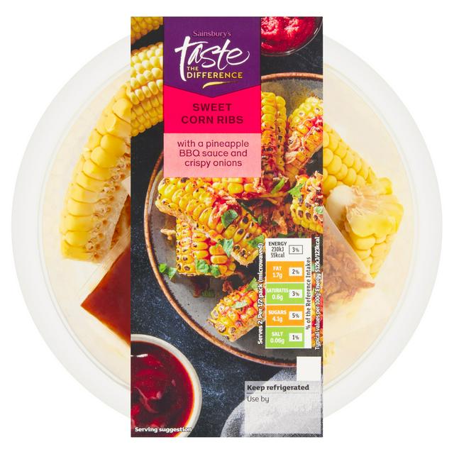 This Sainsbury's Taste the Difference product offers innovative Sweet Corn Ribs, perfect for a quick and flavourful vegetarian meal component. These chilled corn sections are coated in a sweet and tangy pineapple BBQ sauce for a distinct taste experience. The addition of crispy onions provides a satisfying textural contrast to the tender corn.
