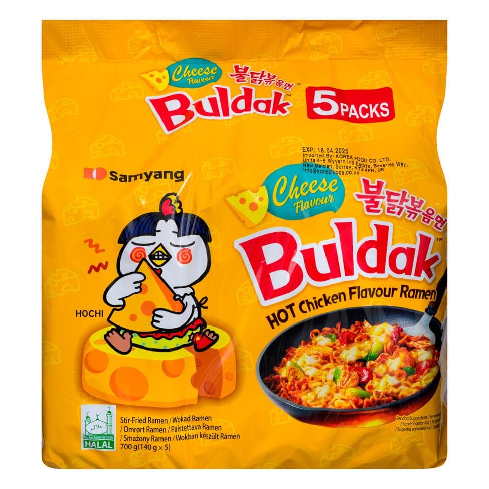 Samyang Buldak Hot Chicken Flavour Ramen (Cheese) (EU Version) multipack offers a fiery blend of Samyang\u2019s iconic spicy chicken flavor combined with a rich, cheesy twist. This version balances the intense heat of the original Buldak ramen with a creamy, cheesy sauce, resulting in a satisfying fusion of spice and comfort. To prepare, cook the noodles, drain most of the water, and mix in the cheese-flavored sauce for a flavorful and indulgent noodle experience.