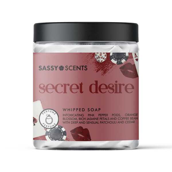 This Sassy Scents Secret Desire soap features an intoxicating fragrance designed for daily cleansing rituals. Its unique air whipped formula creates a distinct, luxurious texture when applied to the skin. Ingredients include Glycerin, Aqua, and conditioning Cocoa Seed Butter.