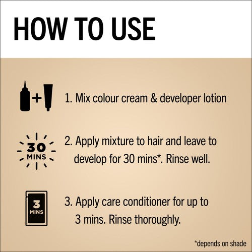 Contains hydrogen peroxide, phenylenediamines (toluenediamines) and resorcinol. Do not use to dye eyelashes or eyebrows. Rinse hair well after application. See bottom of the pack for full list of ingredients. Conduct an allergy alert test 48 hours before each time you colour (see enclosed leaflet), even if you have already used colouring products before. So remember to buy the product 48 hours in advance. In case of any reaction or when in doubt consult a doctor before using any hair colour product. Avoid contact with eyes. Rinse immediately if product comes into contact with them. Wear suitable gloves.