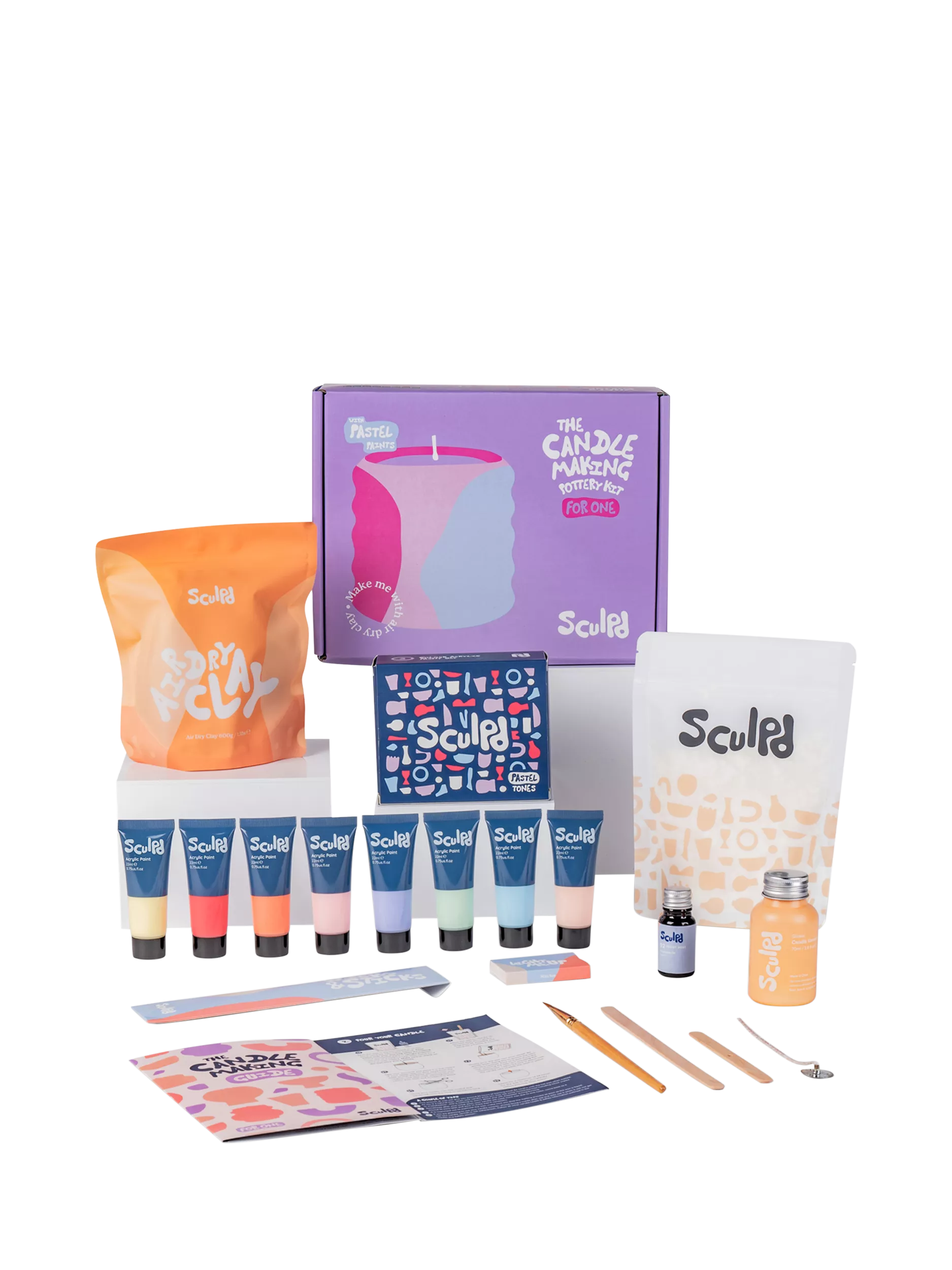 This kit comes with Sculpd's pastel paint set for decoration and contains wax, air-dry clay and everything you need to make one beautiful scented candle.