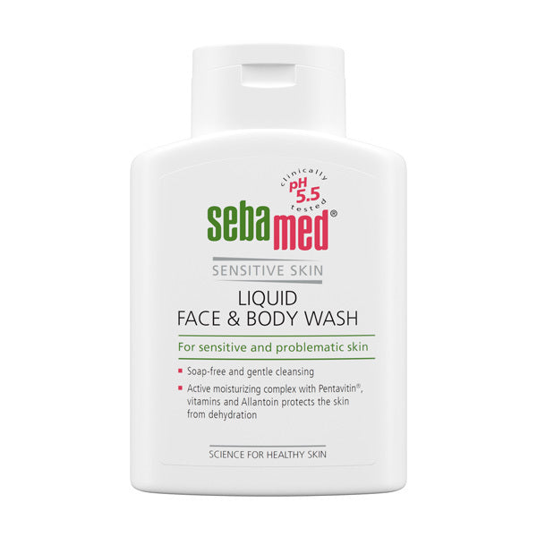 100 soap and alkali free sebamed liquid face and body wash gently cleanses pore deep to leave a unique after wash feeling skin is left clean soft and supple suitable for face and body cleansing its ph 55 value of healthy skin supports and protects the natural barrier function of the skins acid mantle it is well suited as the therapy supportive skin care for skin infections acne atopic eczema psoriasis contact dermatitis and skin mycosis for sensitive and problematic skin panthenol regenerates the skin good skin tolerance very mild wash active ingredients provide pore deep yet gentle cleansing the ph 55 promotes the natural barrier function of the skins acid mantle active moisturizing complex with pentavitin vitamins and allantoin protects the skin from dehydration it helps to protect against dryness as well as external irritants allergens and harmful microorganisms unique after washing skin feels clean soft and supple economical inuse one drop sufficient to wash face and hands dermatologically and clinically tested