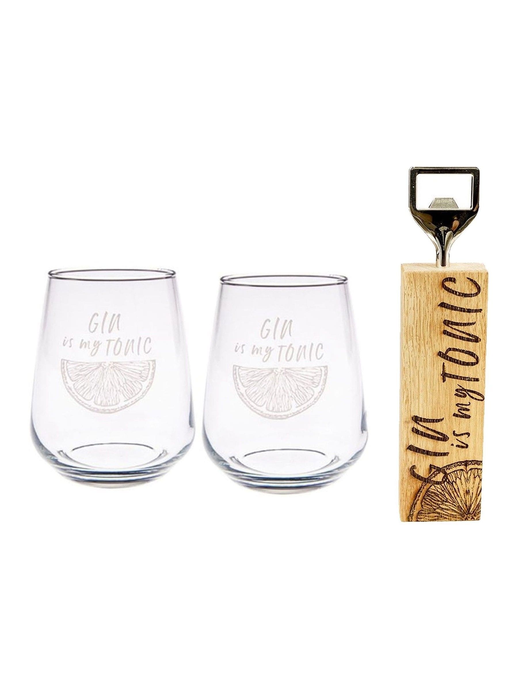 Indulge in your passion for gin with our "Gin is my Tonic" Stemless Glasses and oak bottle opener gift set, offering a playful and chic means to savor your beloved gin concoctions. The clever phrase injects a dose of humor into Gin o clock. The glasses come packaged in an attractive gift box, while the oak coasters are delicately wrapped in a Selbrae House belly band and branded tissue paper, transforming this set into a fun and considerate gift for gin enthusiasts.