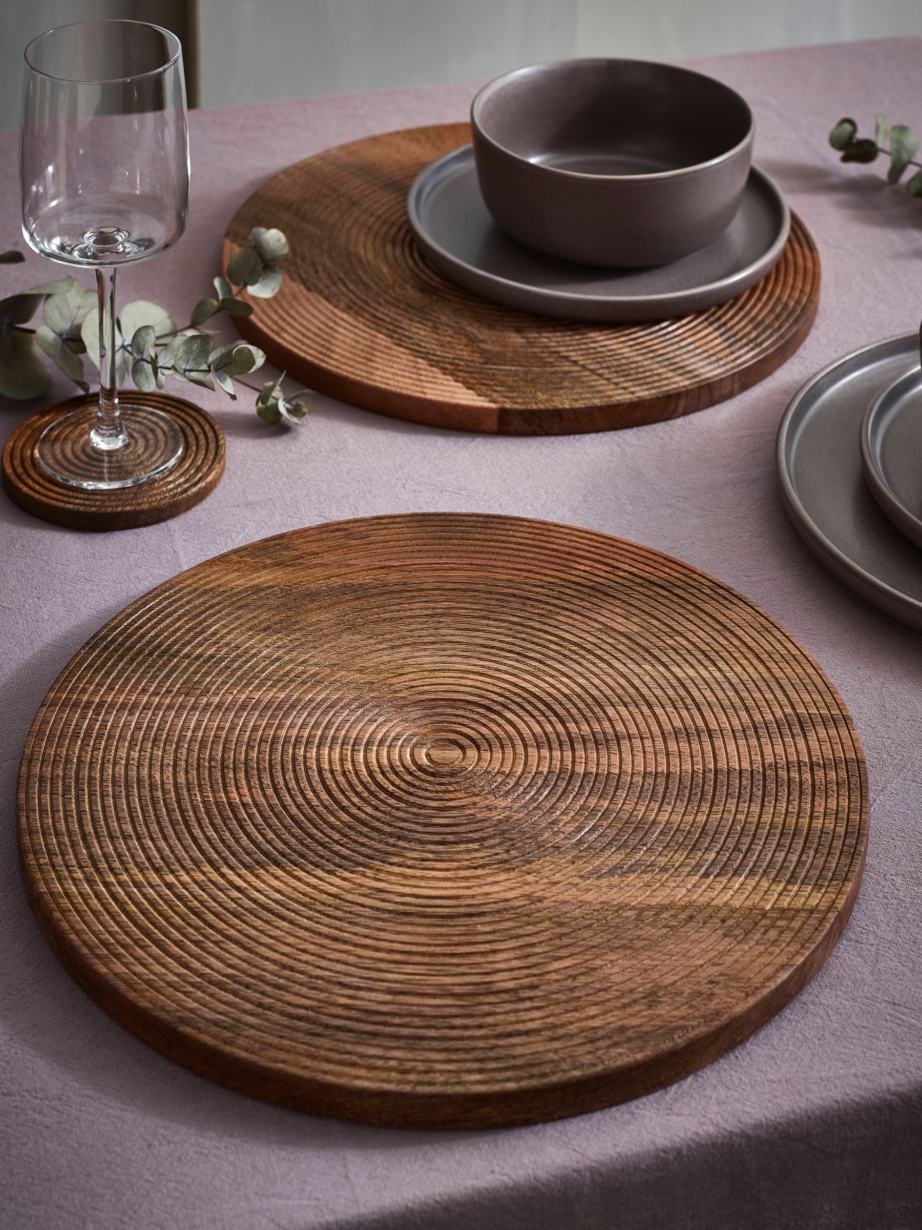 Crafted from mango wood, this set of 2 etched round placemats blend elegance with functionality.Perfect for both casual and formal dining settings, they are sure to impress your guests whilst protecting your table surfaces. Due to the nature of the mango wood and the woodcraft involved in this product, each... Read More