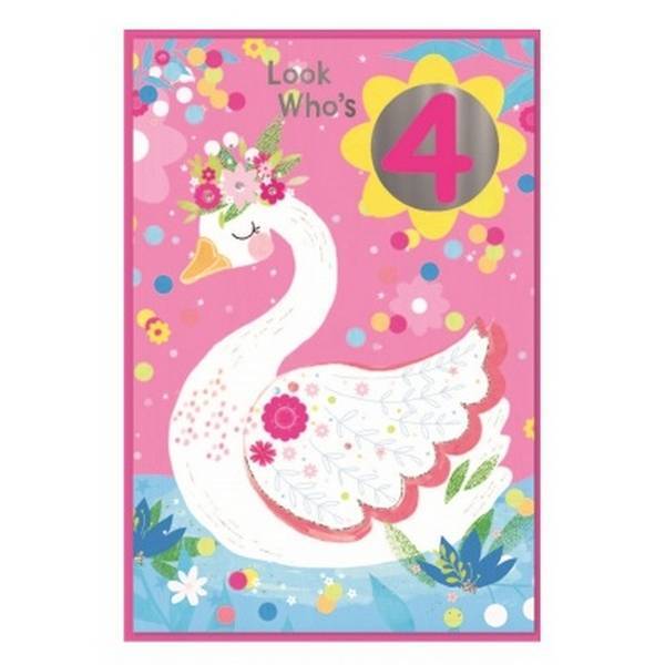 Material: Card. Design: Number, Printed, Swan, Text. Occasion: 4th Birthday.