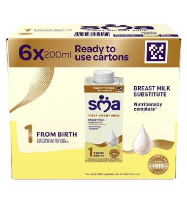 SMA First Infant Formula is a Stage 1 product, formulated as a nutritionally complete breast milk substitute for babies from birth. This product supports combination or bottle feeding when breast milk is not chosen, ensuring comprehensive nutrition for early development. The ready to feed multipack provides convenient portions, minimising preparation time for parents. This formula meets all legislative requirements for infant formula substitutes. SMA Follow-on Milk (Stage 2) is available to support babies from six months.