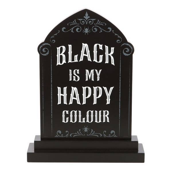 Enhance your home décor with the Something Different Black Is My Happy Colour standing sign. This striking tombstone-shaped piece is crafted from durable MDF material for lasting display. Its printed text offers a clear, minimalist statement for any room or shelf arrangement.