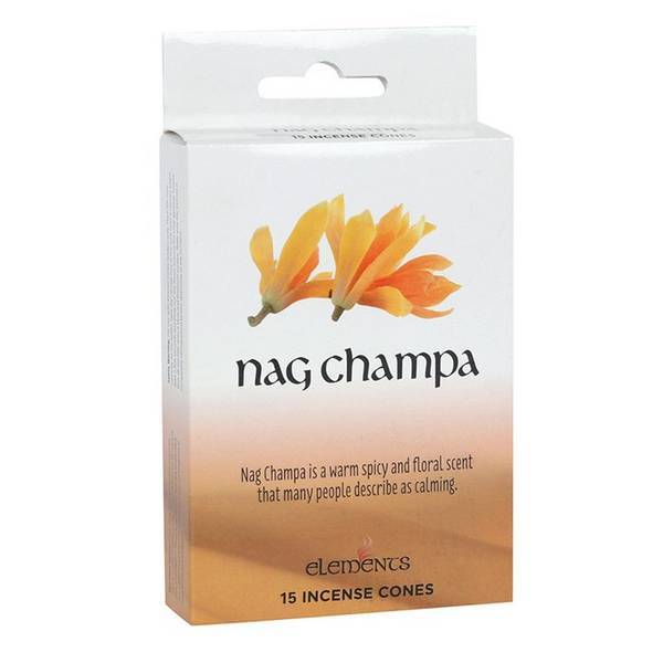 Read MoreNag Champa fragranced incense cones by Elements. Warm, spicy and floral scent. Each pack contains 15 incense cones.
