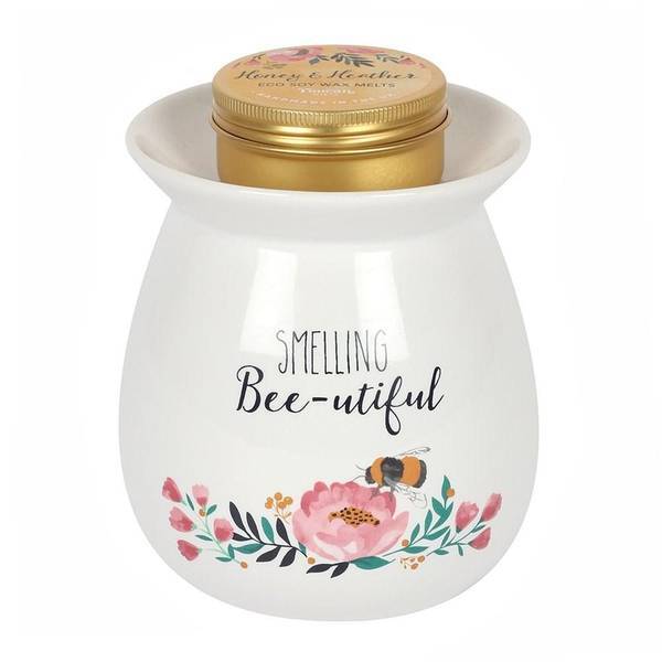 This set includes a ceramic burner and accompanying soy wax melts for home fragrance. The decorative design features a bee and floral motif suitable for display. The contents are presented neatly packaged within a box ready for use or gifting.