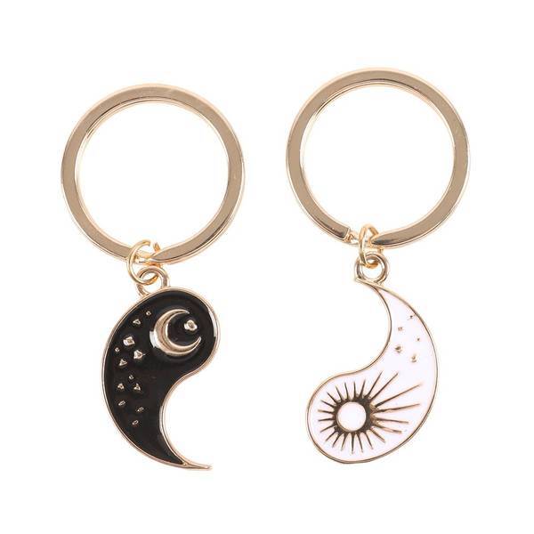 Material: Alloy. Design: Crescent Moon, Stars, Yin Yang. Split Ring. Packaging: Cardboard Backed, Euro Hook.