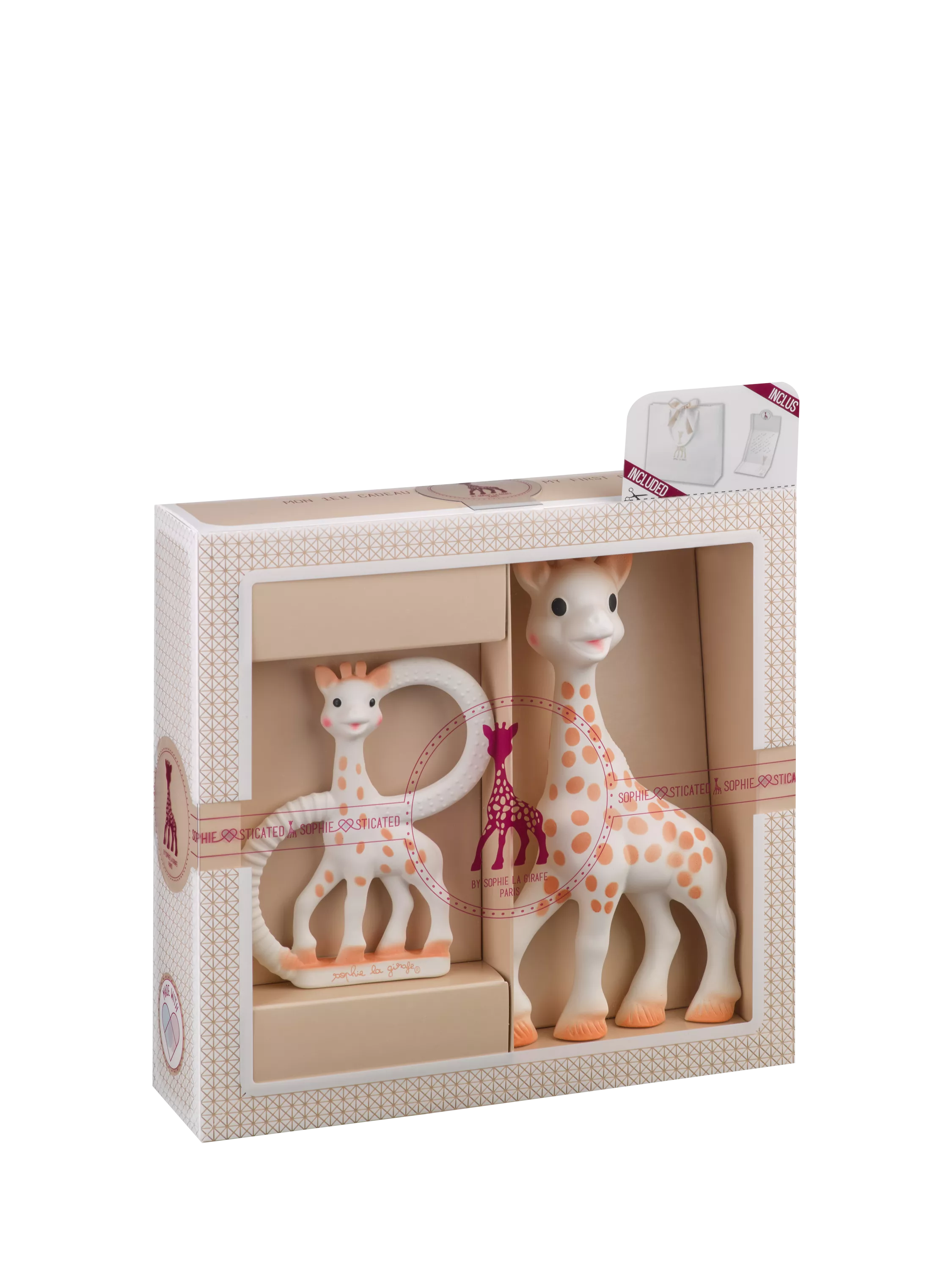 Packaged in a premium gift box to give a contemporary, modern and sophisticated look. Each set comes with its own Sophie la girafe branded gift bag and a gift card, for including your own special message. This really is the complete first gift set!