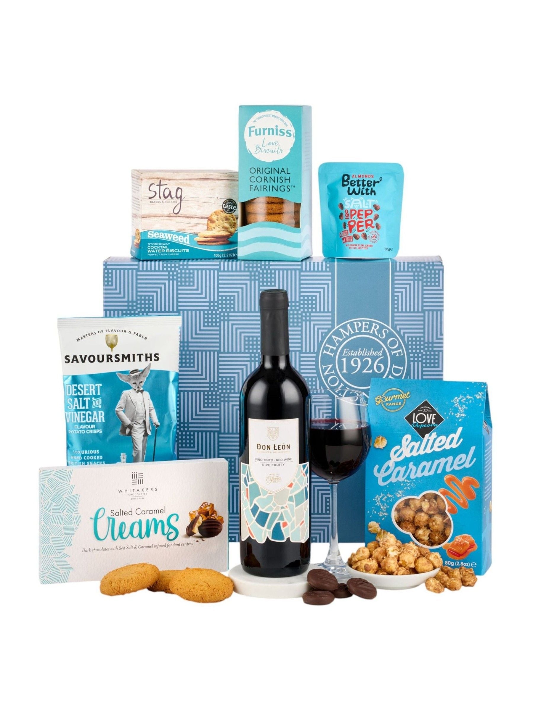 Don Leon Spanish Red Wine 75cl. Furniss Original Cornish Fairings 180g. Whitakers Salted Caramel Creams 150g. Savoursmith Desert Salt & Vinegar 40g. Love Popcorn Salted Caramel 100g. Better With Salt & Pepper Almonds 30g. Stag Cocktail Water Biscuits with Seaweed 100g. Packed in a Geometric Print Gift Box.