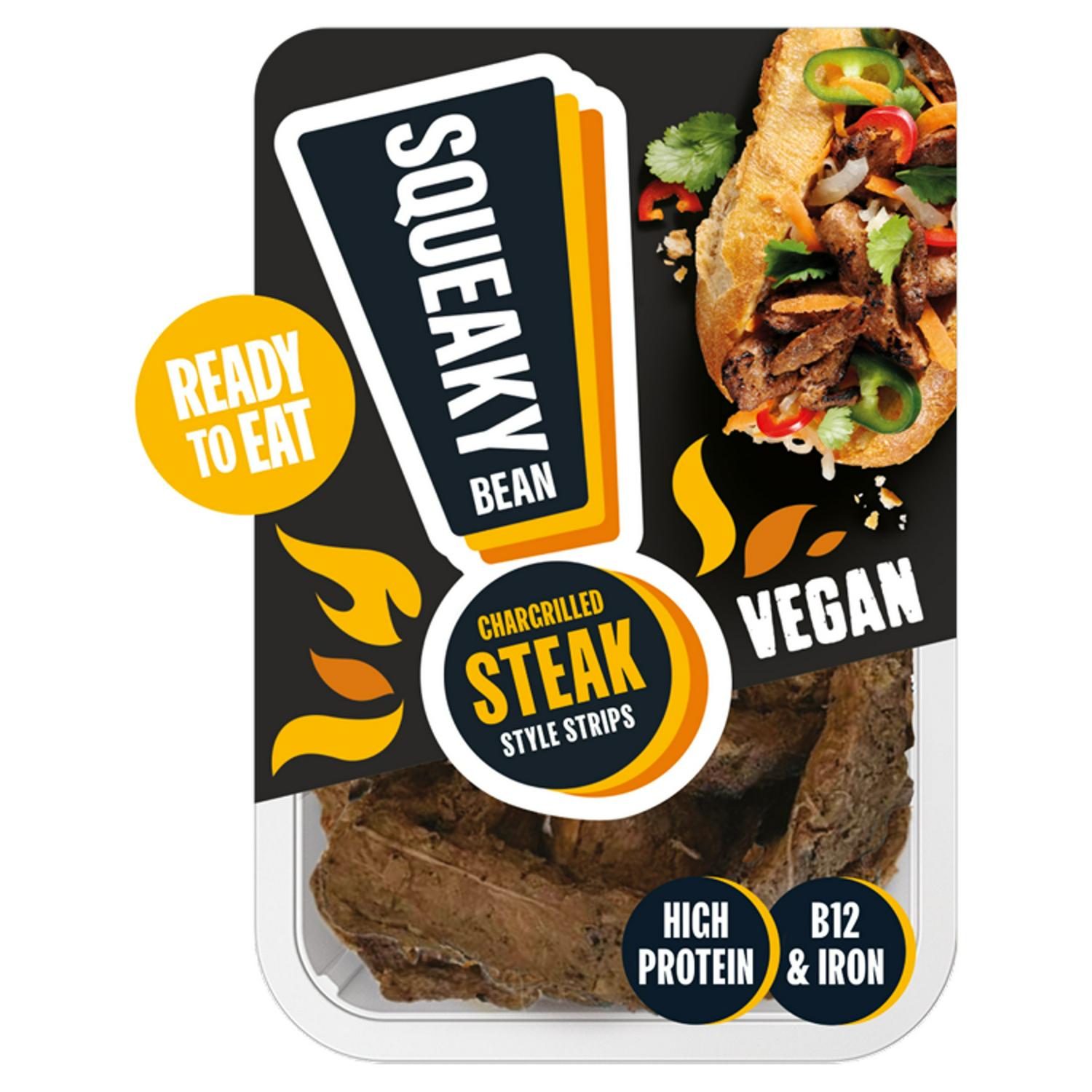 These Squeaky Bean strips capture a distinct chargrilled steak style flavour profile, perfect for vegetarian or vegan meals. They are ready to eat directly from the 120g pack, offering a highly convenient plant-based protein source for quick preparation.