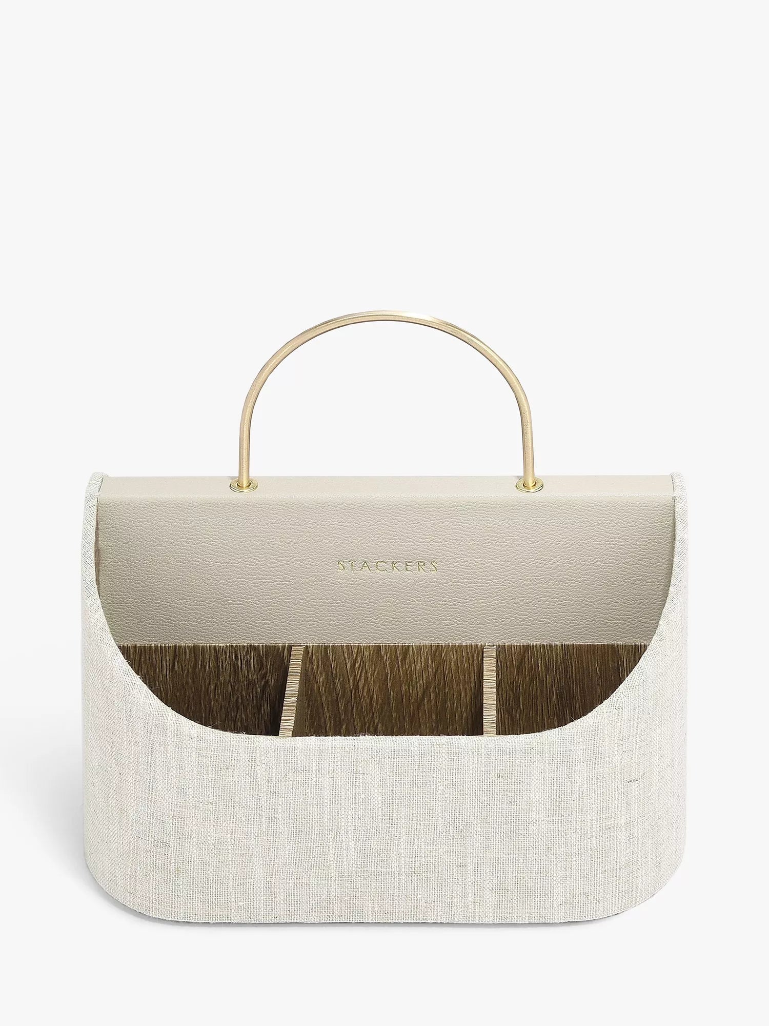 The Stackers Desk Caddy is a handy, portable organiser for stationery. With multiple compartments to separate and organise stationery. Featuring a brushed gold handle and finished in a neutral Oatmeal PU and Linen mix, to complement your home office aesthetic.