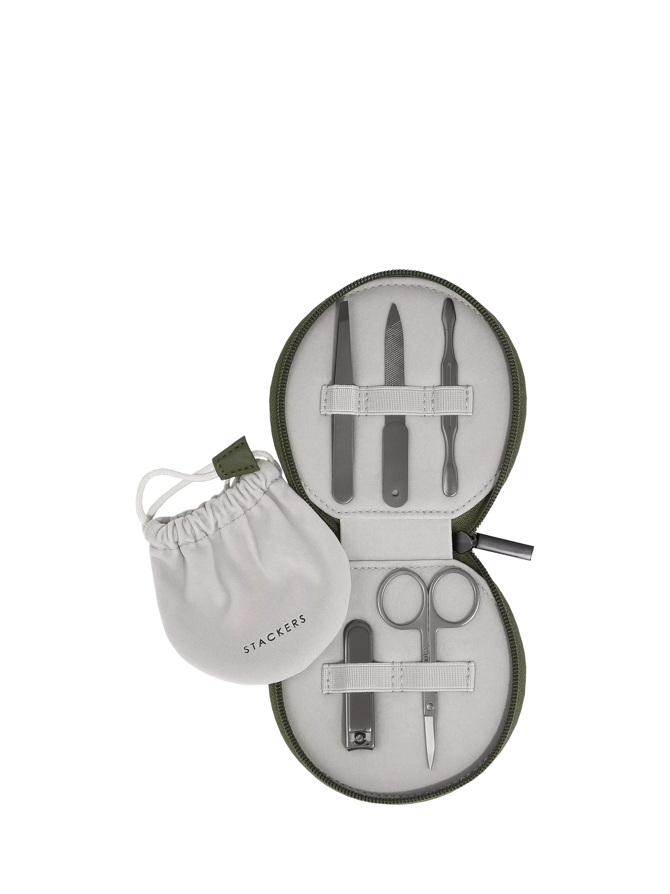 The Manicure Set contains all the essentials to keep your nails perfectly manicured on-the-go. The 5 piece set consists of scissors, nail clippers, tweezers, a cuticle pusher and nail file, as well as an additional separate draw-string pouch. The elasticated loops keep tools in place, whilst the velvet lining and faux-leather exterior give it a luxurious feel. The compact size and zip fastening make it a perfect beauty gift and is ideal for travel or keeping in a washbag or handbag.