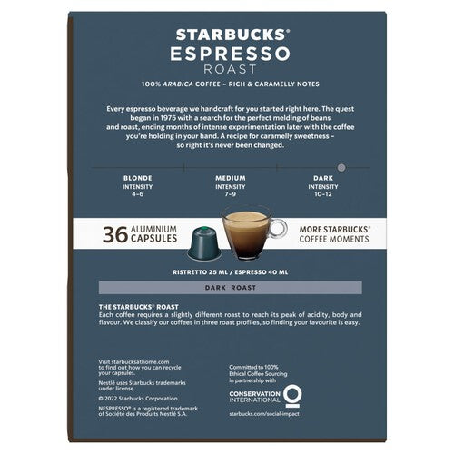 Enjoy the signature Starbucks experience conveniently at home with these Dark Espresso Roast capsules. This package provides 36 servings of roast and ground coffee designed specifically for use within the Nespresso system.