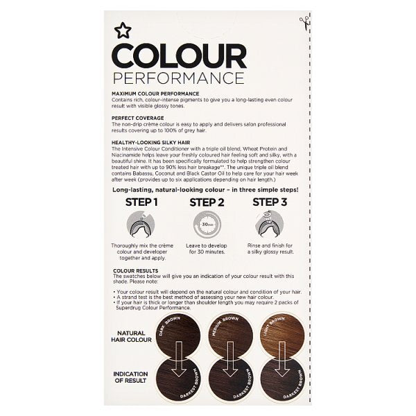 Achieve long-lasting, natural-looking colour with Superdrug Colour Performance in 3.0 Natural Darkest Brown. This easy-to-apply, non-drip crème colour delivers rich, even, and visibly glossy results in three simple steps.