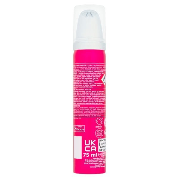 WARNING – DANGER EXTREMELY FLAMMABLE AEROSOL Caution: Pressurised container: May burst if heated. Keep away from heat, hot surfaces, sparks, open flames and other ignition sources. No smoking. Do not pierce or burn, even after use. Protect from sunlight. Do not expose to temperatures exceeding 50°C. Do not spray on an open flame or other ignition source. Keep out of reach of children.CARE AND SAFETY ADVICEUse only as directed. Do not apply to broken or irritated skin. In unlikely event of adverse skin reaction, discontinue use. Avoid contact with eyes. In case of contact with eyes, rinse immediately with clean water and seek medical advice if symptoms persist. Do not place can on or spray near polished or painted surfaces. Avoid contact with absorbent material and clothing as staining may occur.