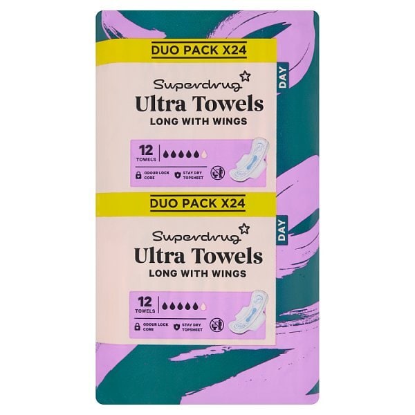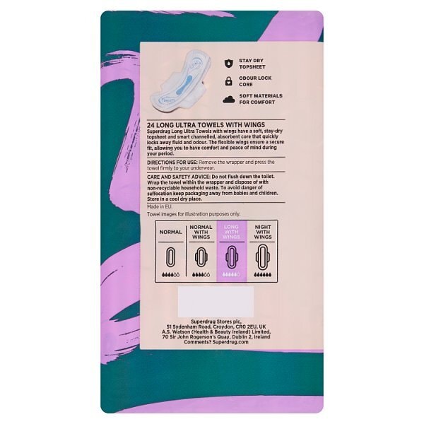 These Superdrug long ultra towels are engineered for dependable period protection and reliable comfort. They feature a soft staydry topsheet combined with a smart channelled absorbent core that actively manages fluid and locks away odour. You can feel secure with this reliable design throughout your day.