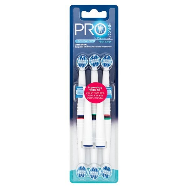 procare total clean replacement electric toothbrush heads access each tooth to work effectively to clean even in hard to reach areas designed for more effective cleaning along the gum line than a manual toothbrush it also features indicator bristles that fade with use to remind you to replace brush head for better cleaning vs a regular manual toothbrush based on in vitro laboratory testing designed to fit procare rechargeable electric toothbrush also compatible with most oralb electric toothbrushes does not fit vitality sonic pulsonic io series oralb sonic complete crossaction power battery toothbrush oralb complete battery toothbrush and 3d white battery toothbrush oralb vitality crossaction power oralb sonic complete oralb io oralb complete 3d white and pulsonic are registered trademarks of the procter gamble company or one of its affiliates